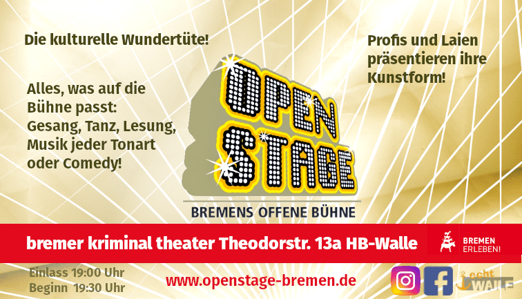![]() ![]() ![]() Das Vegesacker Geschichtenhaus macht die Stadtgeschichte von Bremen-Nord lebendig. In kleinen Theaterszenen entführen unsere Darsteller Sie in das Vegesack des 19. Jahrhunderts. Besuchen Sie uns auf der legendären Lange-Werft, sprechen Sie mit den Handwerkern über die Arbeit in dieser Zeit oder trinken Sie auf ein langes Leben in der Hafenschänke und vor allem: Lassen Sie […] ![]() ![]() ![]() ![]() So wie Schwarzschimmel in die Badezimmerecken kehrt auch Dad Horse Ottn seit nunmehr 20 Jahren immer wieder zurück ins Lagerhaus, um dort seine schrägen Lieder aus dem Seelenkeller vorzutragen. Unter dem Motto „Viel Licht, viel Schatten“ wird der schratige Mandolinenprediger seelisch auf das neue Jahr vorbereiten. Dad Horse wird begleitet von Michael Jungblut (E-Gitarre), Olaf […]