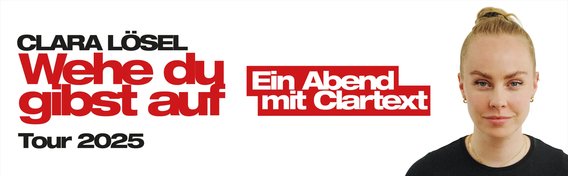 Wenn es derzeit jemanden gibt, der mit Worten etwas bewegt, dann ist es Clara Lösel. Sie ist Stimme und Herzschlag ihrer Generation. Ehrlich, verletzlich und ungemein klug verpackt die 26-Jährige ihre Beobachtungen, Gedanken und Erfahrungen in poetische Texte, die monatlich über 20 Millionen Menschen alleine auf ihren Social Media-Profilen berühren. Nach ersten überwältigend erfolgreichen Live-Auftritten zur Veröffentlichung ihres Bestsellers „Wehe Du gibst auf“ (April 2025/ NOW Verlag) geht Clara Lösel im Herbst 2025 auf erste große gleichnamige Deutschland-Tournee. In insgesamt acht Städten präsentiert sie als Poetry Artist Highlights aus ihrem inzwischen bereits in der 7. Auflage erhältlichen Spiegel-Besteller, aber auch neues, unveröffentlichtes Repertoire: „Wehe Du gibst auf“ Live 2025 – ein wundervoller und zugleich einzigartiger Abend mit Clartext.