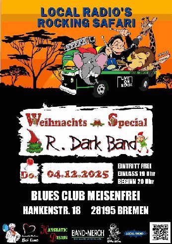 Auch dieses Jahr wird das Weihnachts-Special der Rocking Safari von der R. Dark Band bestritten. Das kann man dann wohl Tradition nennen! R. Dark Band – das sind die beiden Urgesteine und Gründungsmitglieder Frank Ostersehlt und Peter Weiß. Seit über 25 Jahren verfassen die zwei selbstgeschriebene Songs und würzen diese mit frechen deutschen Texten. Das Repertoire reicht von Blues über Rock bis hin zu Balladen und Country-Anleihen. Live sind neben viel Spaß und Spielfreude häufig auch “Special Guests” als Verstärkung auf der Bühne zu erwarten. Übrigens war diese Band bereits bei der allerersten Safari (damals noch an anderer Spielstätte) dabei und beweist damit, dass sie nicht nur musikalisch top ist, sondern auch über ein ziemliches Durchhaltevermögen verfügt.